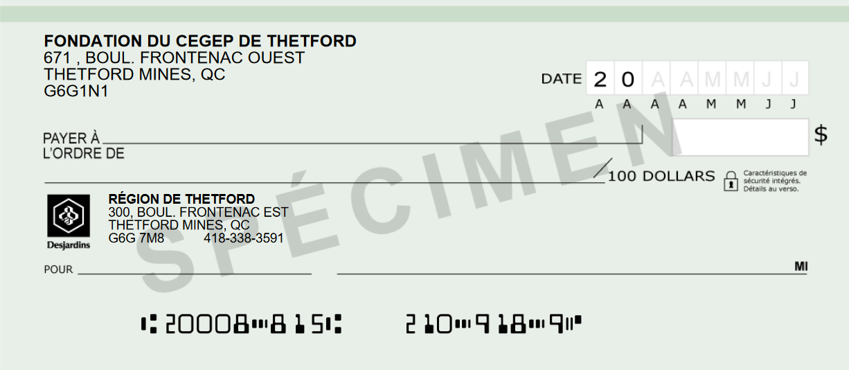 Tu peux nous envoyer un chèque au nom de la “Fondation du Cégep de Thetford et de Lotbinière”, par la poste ou sur place.