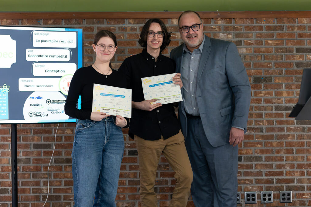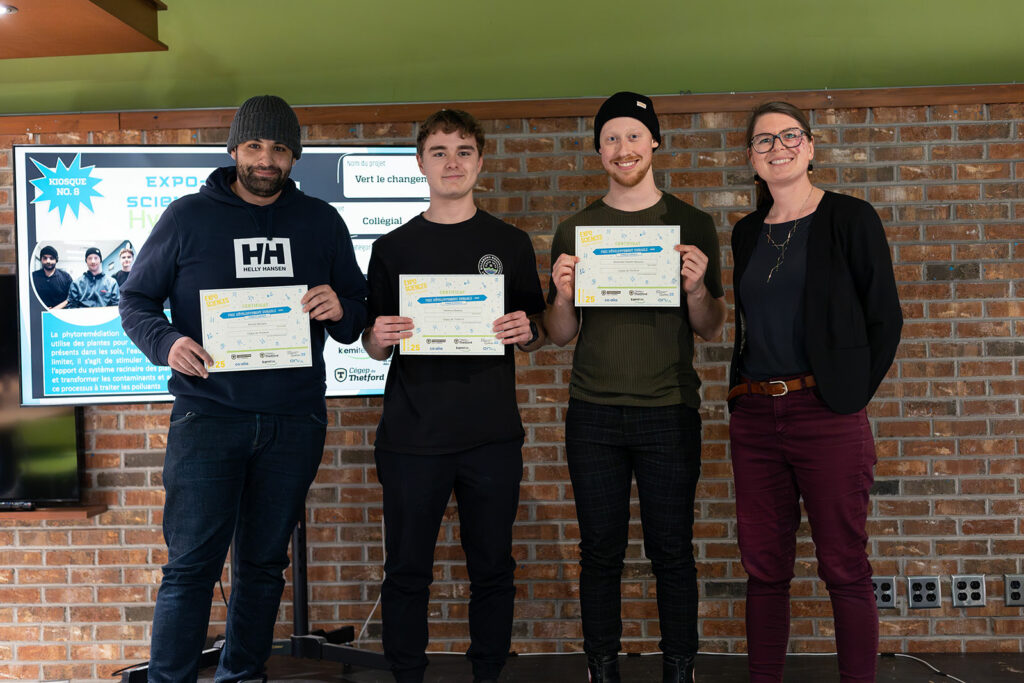 Cette année, les participantes et participants concouraient également pour une bourse en Développement durable, remise par le Cégep de Thetford dans le cadre de son plan d’action en développement durable. Maxence Beaulac, Rachid Metsaha et Alexandre Ouellet-Beaulieu se sont distingués avec leur projet Vert le changement, décrochant une bourse de 250 $.